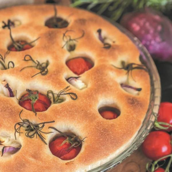 Focaccia is a versatile canvas. Try a variety of different toppings: olives, feta cheese, thyme, sun-dried tomatoes, rosemary, grapes.