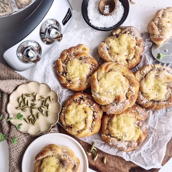 Mix lukewarm milk with 1 tsp sugar and dry yeast in a small bowl. Leave for 10 minutes for the yeast to bloom.