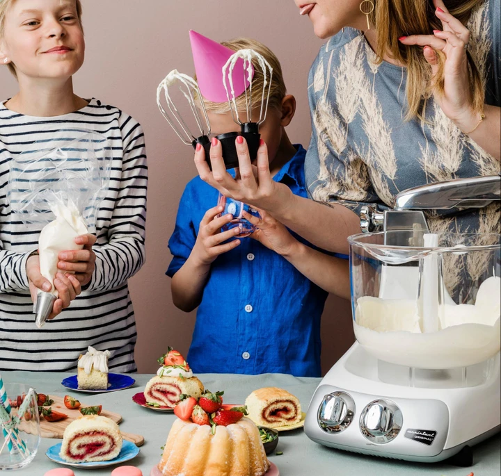 Ever since 1940, we have designed our robust kitchen assistents in Sweden. We have built them so that they can handle hard kitchen work and last a really long time. With their 16 different accessories, they are happy to help you with everything from baking sourdough bread to making smoothies, or your own pasta.