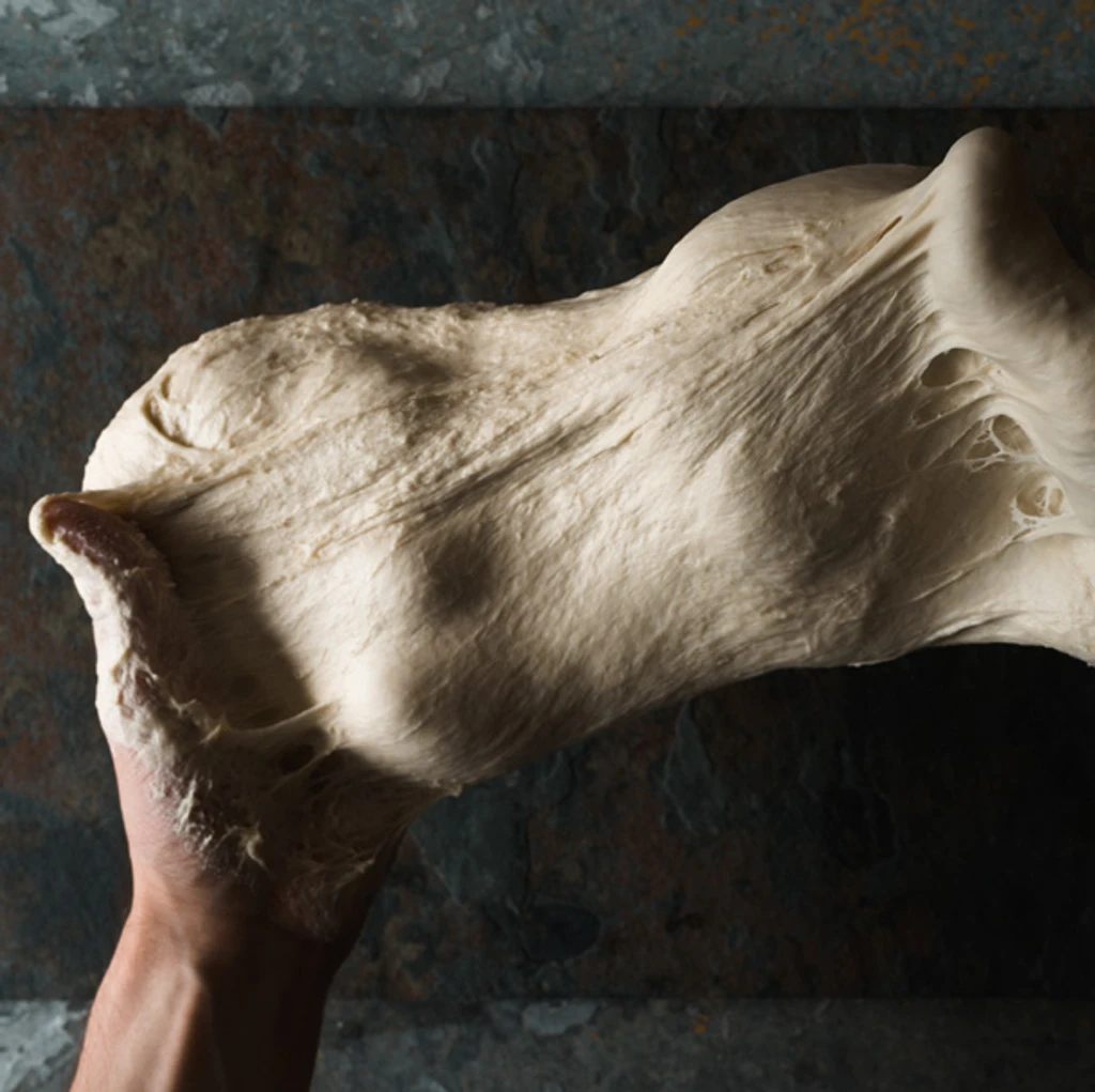 Um zu überprüfen, ob der Teig ausreichend durchgeknetet wurde, können Sie ein kleines Stück Teig nehmen und vorsichtig auseinanderziehen. Wenn der Teig fertig ist, lässt es sich gut ziehen, hält zusammen und bildet ein „Glutenfenster“. Der Teig fühlt sich elastisch und ein wenig „zäh“ an. Wenn der Teig noch nicht fertig ist, reißt er und fühlt sich stumpf an, eher wie ein Stück Ton. Kneten Sie in diesem Fall das Teigstück in der Hand ein wenig weiter. Wenn es sich dann geschmeidiger anfühlt, wissen Sie, dass der Teig noch länger durchgeknetet werden muss.