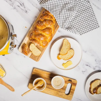Del rullen på langs i to dele med en skarp kniv og vend snitfladen opad. Flet delene sammen og form derefter til en krans. Løft forsigtigt kransen over i en rund bageform og lad den hæve tildækket i 1 time.