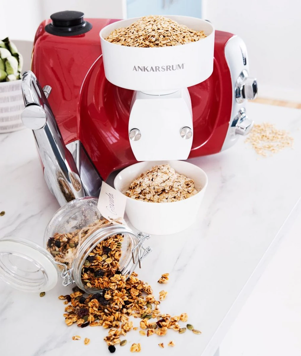 Du behøver ikke at være bagenørd eller superkok for at få glæde af Ankarsrum müslikværn. Med vores kværn kan du eksperimentere med din egen hjemmelavede müsli – når den sidder lige i skabet, så køber du aldrig müsli i supermarkedet igen.