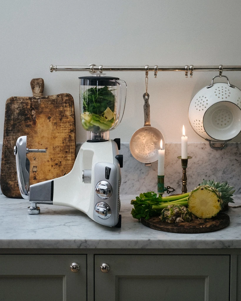 Put your Ankarsrum Assistent on its side when you want to use the blender. The blender holds 1.5 liters, and handles 1.3 liters of liquid at the same time. Make everything from smoothies and drinks to pesto and hummus!
