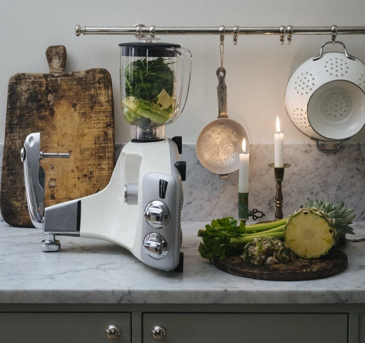 Tumba de lado la Ankarsrum Assistent cuando quieras utilizar la batidora. Tiene capacidad para 1,5 litros y es capaz de trabajar con 1,3 litros de líquido al mismo tiempo