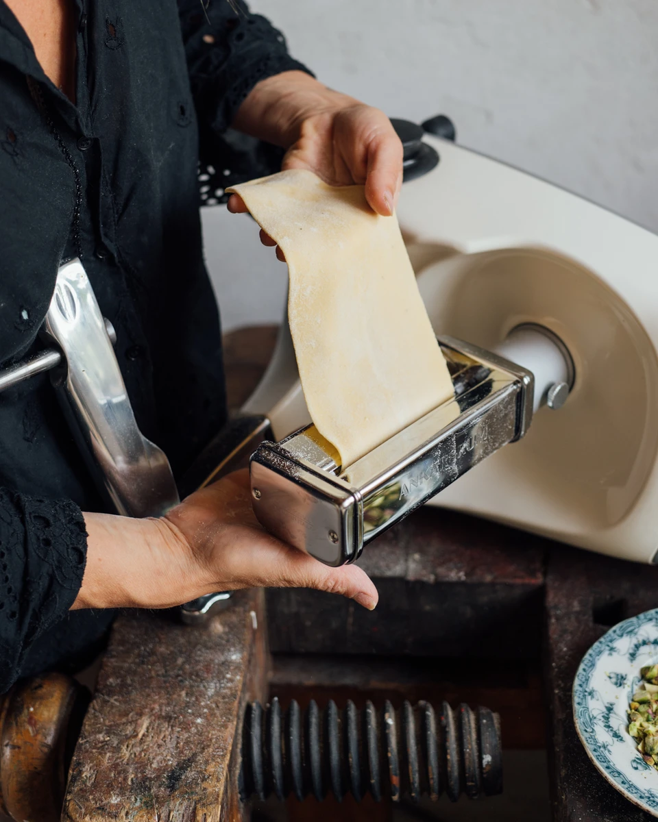 El rodillo para lasaña hace láminas de pasta de 14,5 centímetros de ancho y un grosor que va desde 0,6 hasta 4,8 milímetros. Con ellas puedes hacer fácilmente desde lasañas, raviolis y tortellini hasta espaguetis y todas las opciones que hay entre medias. Estas láminas también son perfectas para preparar fettuccine o pappardelle con otro de nuestros accesorios para pasta.