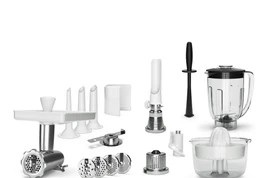 El paquete de accesorios grande DeLuxe contiene: picadora, 3 embudos para embutidos de 10/20/25 mm, bandeja de alimentación, mazo, 4 discos con orificios de 2,5/4,5/6/8 mm, trituradora, rallador, discos para pasta, accesorio para galletas, batidora, exprimidor, protector contra salpicaduras para la picadora.
