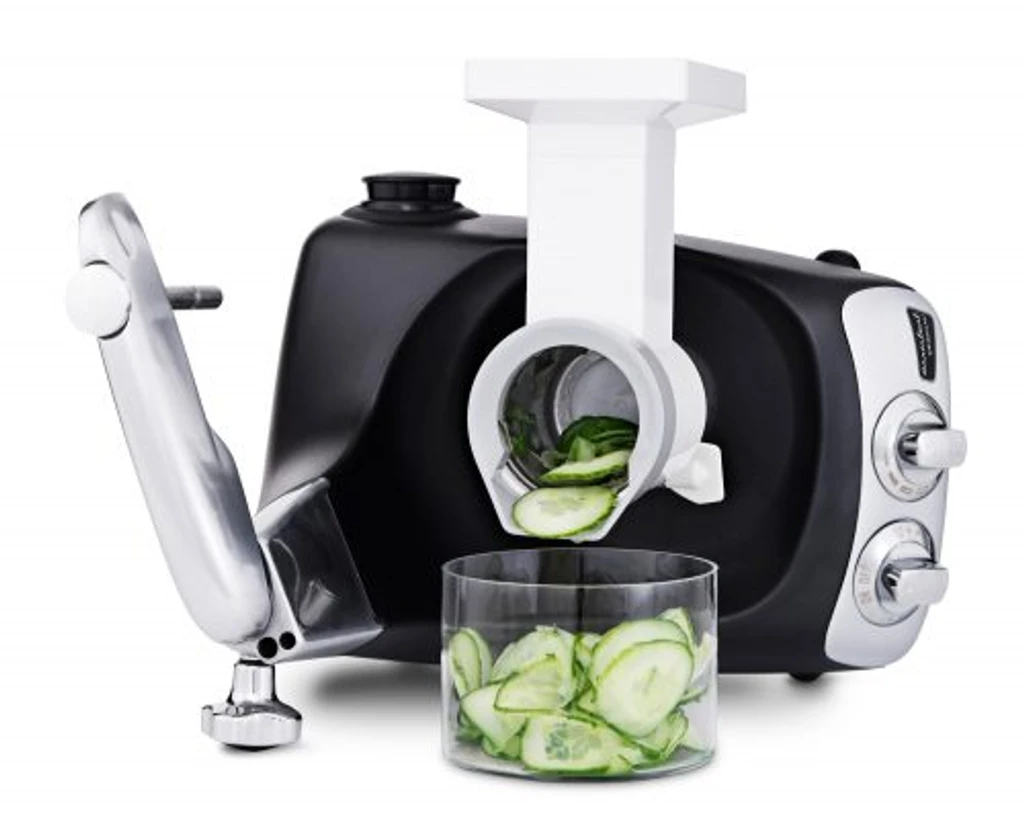 C'è uno spremi agrumi, non meno di sei diversi tamburi tagliaverdure che preparano di tutto, dal rösti all'insalata di cavolo, e un setaccio che è adatto per le confetture di frutta come per le puree.