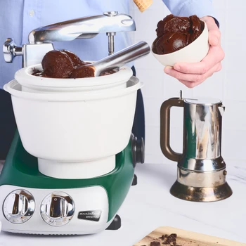 Avvia l'Assistent a bassa velocità in modo che la ciotola refrigerante ruoti, versa lentamente la miscela attraverso l'apertura del coperchio.