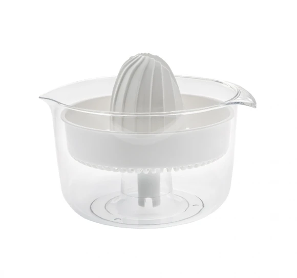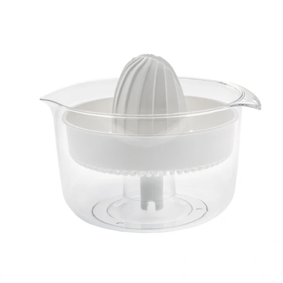 • The citrus press consists of a transparent container/bowl and a white citrus press reamer.
