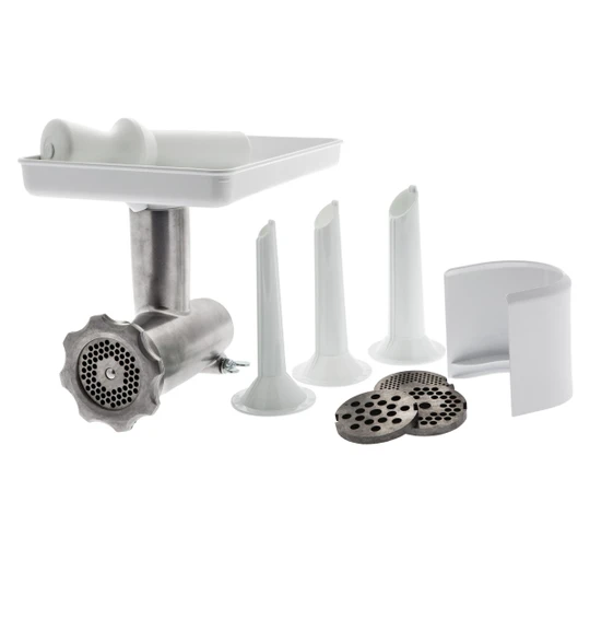 Mincer Small contains Mincer, 3 sausage horns 10/20/25 mm, feeder tray, feeder plug, holediscs in 2.5, 4.5, 6, 8 mm and a splashguard.