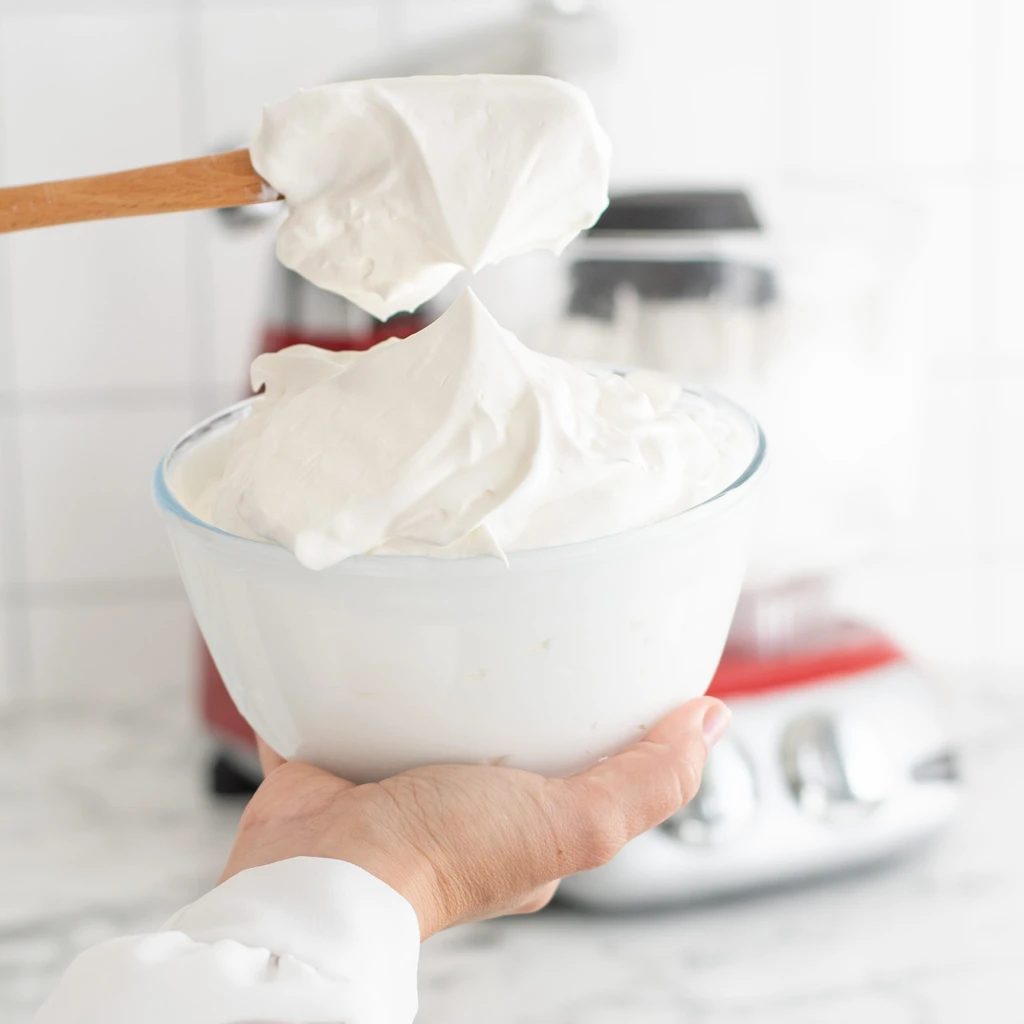 Voeg een beetje bakpoeder toe klop de room stevig op. Het bakpoeder zorgt ervoor dat de slagroom stabieler is en makkelijker aan te brengen op cupcakes of taarten.