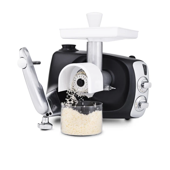 Mincer with hole discs & sausage horns – process your own ground meat, shape your own sausages, or prepare vegetarian options like falafel or chickpea patties. Easily adjust the texture from fine to coarse grinds.