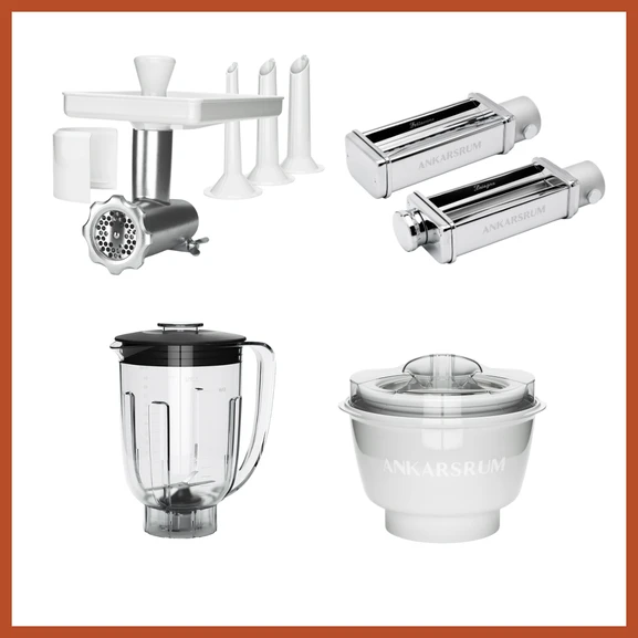 Med det här kompletta tillbehörspaketet från Ankarsrum får du alla tillbehör du behöver: Glassmaskin, Mixer, Köttkvarn & Pastakit