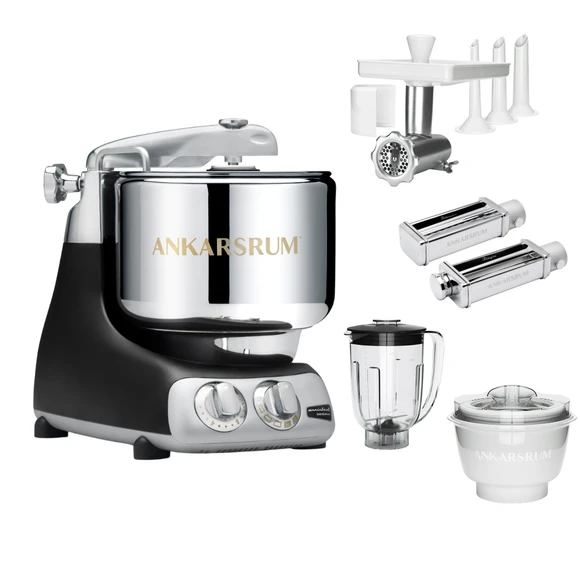 Med det här kompletta paketet från Ankarsrum får du alla tillbehör du behöver: Ankarsrum köksassistent, Glassmaskin, Mixer, Köttkvarn & Pastakit