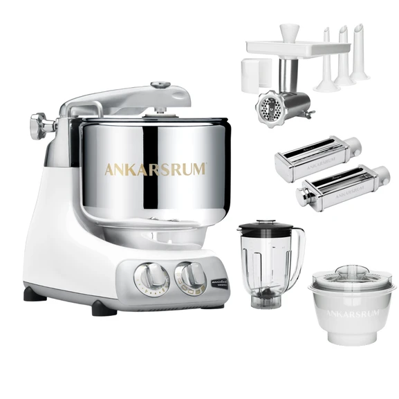Med det här kompletta paketet från Ankarsrum får du alla tillbehör du behöver: Ankarsrum köksassistent, Glassmaskin, Mixer, Köttkvarn & Pastakit
