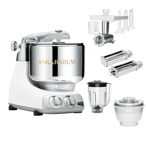 Med det här kompletta paketet från Ankarsrum får du alla tillbehör du behöver: Ankarsrum köksassistent, Glassmaskin, Mixer, Köttkvarn & Pastakit