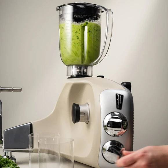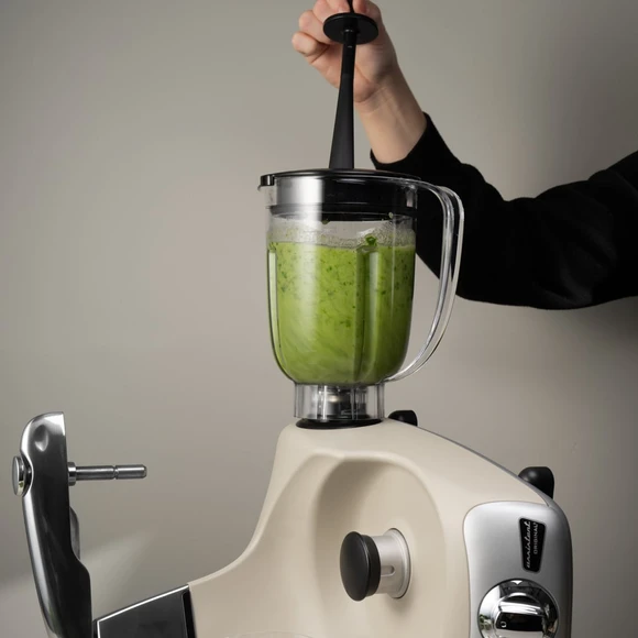 Mixerkannan är ett mångsidigt tillbehör för din Assistent Original som enkelt mixar smoothies, krossar bär och skapar krämiga såser utan problem. Du fäster Mixerkannan genom att tippa din assistent på sidan. Kannan har en kapacitet på 1,5 liter, med en maxvolym för användning på 1,3 liter. Mixerpinnen hjälper dig att pressa ner ingredienserna mot knivarna och röra runt, oavsett om det gäller hackad choklad eller en krämig hummus.