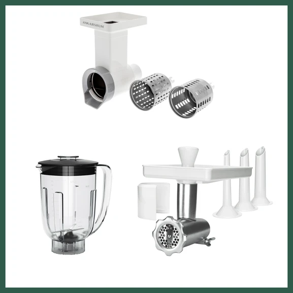 Med Ankarsrum köksassistent, Blenderkannan, Köttkvarnen och Grönsaksskäraren blir vardagsmaten både enklare och dessutom snabbare att laga. Du kan förbereda allt från stora satser mat, hacka grönsaker på nolltid och mixa soppor och såser – allt med samma maskin.