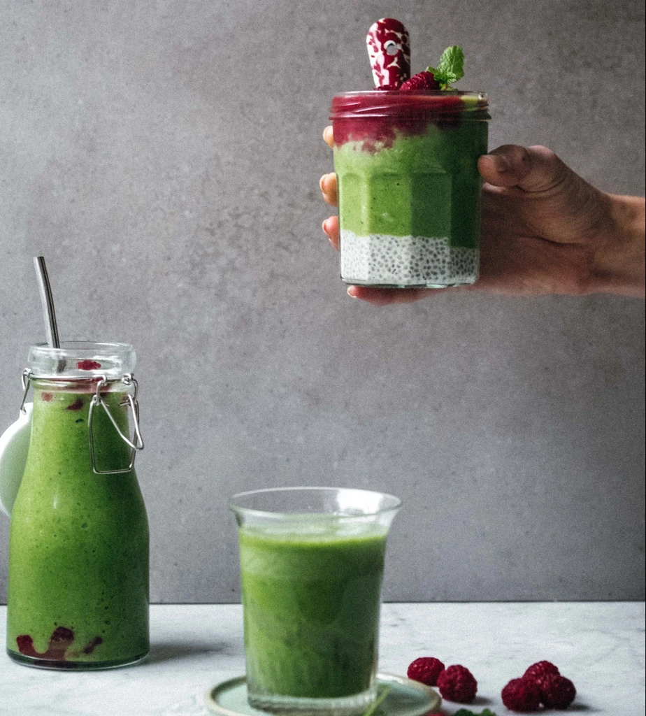 Add all the ingredients, except for chia pudding and raspberries)